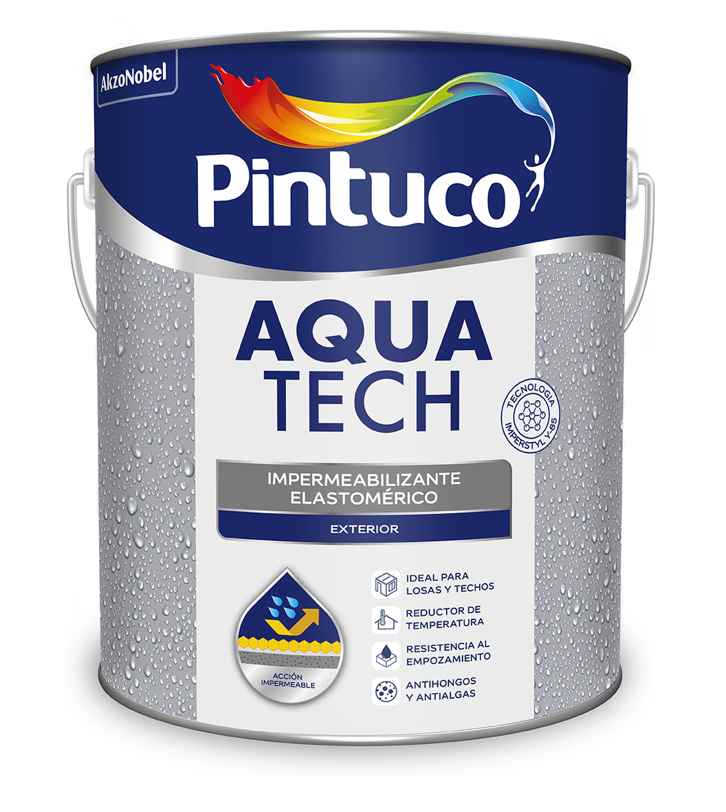 Pintuco AquaTech Impermeabilizante Elastomérico con tecnologia Imperstyl, se caracteriza por darle protección a las superficies horizontales y verticales contra la lluvia, el viento, así como de la lluvia ácida. Su tecnología posee la capacidad de reducir la sensación térmica en las áreas internas, resiste al ampollamiento, los hongos, ensuciamiento y al empozamiento de agua. Formulado para penetrar profundamente en fisuras, sellando la superficie y evitando filtraciones de agua. Su excelente elongación permite la contracción y dilatación de la película sobre la superficie. Es para uso residencial, comercial e industrial.